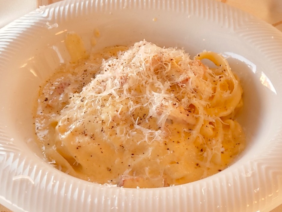 カリカリに炒めたベーコンと濃厚なソースが絡む定番パスタ。