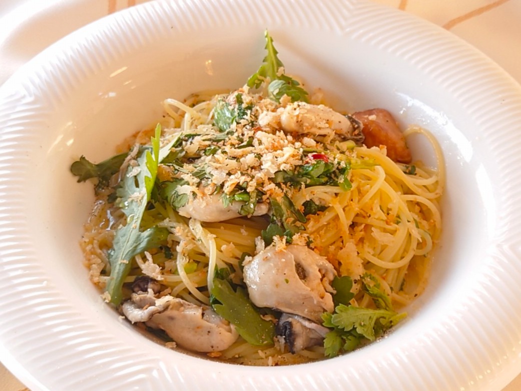 栃木県産の野菜と国産牡蠣を合わせた贅沢パスタ。